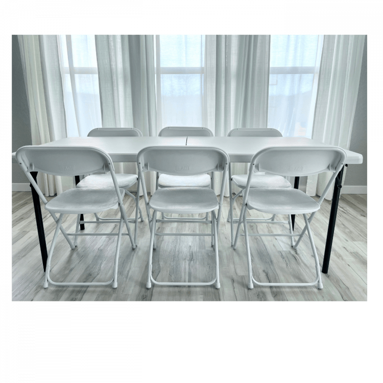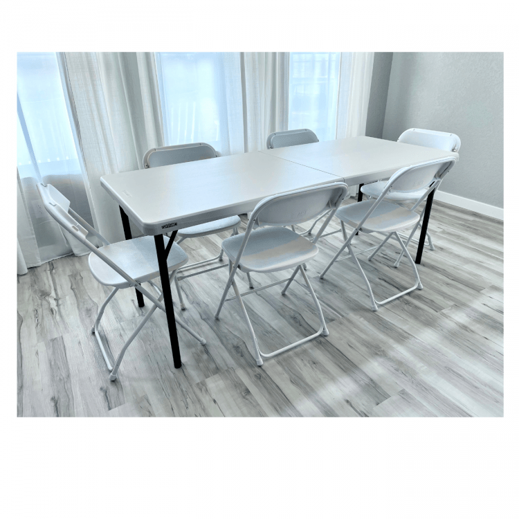 This 6 Ft. Folding Table is a versatile addition to any party or event, providing ample space for food, crafts, or seating arrangements. Its lightweight design and foldable feature make it incredibly easy to transport, set up, and store away. With its durable surface, it can withstand spills and the hustle and bustle of any social gathering, making it an essential piece of equipment for birthday parties, family reunions, outdoor picnics or your corporate events. Whether you're serving snacks or setting up a buffet, or needing extra seating, this folding table meets all your needs with ease and reliability.