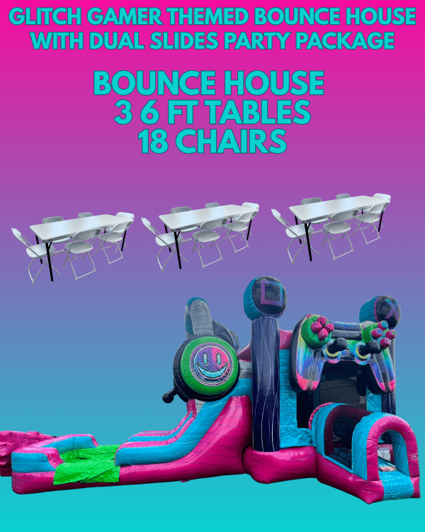 Ready to host the ultimate party for the gamer in your life? At Party Up San Antonio, we’ve engineered the perfect "all-in-one" solution with our Glitch Gamer Themed Bounce House with Dual Slides Party Package. This high-tech, high-energy bundle is designed to be the centerpiece of any San Antonio celebration, combining a massive interactive inflatable with all the essential seating your crew needs.